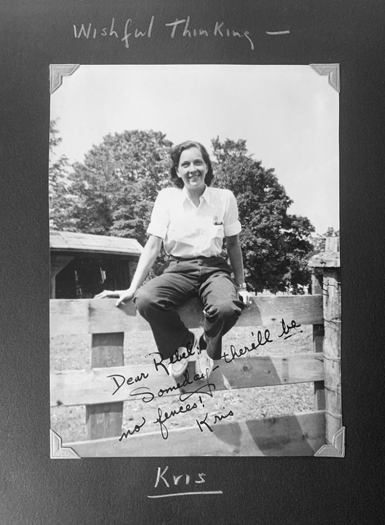 Mounted inside is a picture of Barbara “Kris” Olsen, a longtime McIlroy friend with whom she scaled mountains and went sailing. It was probably taken in the late 1950s or early 1960s. A garage is visible in the background across a medium-sized yard, large trees beyond that. Olsen smiles wide in the foreground dressed in a button-up shirt, pants and loafers while sitting on a fence.